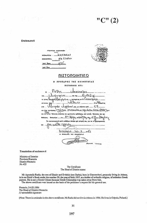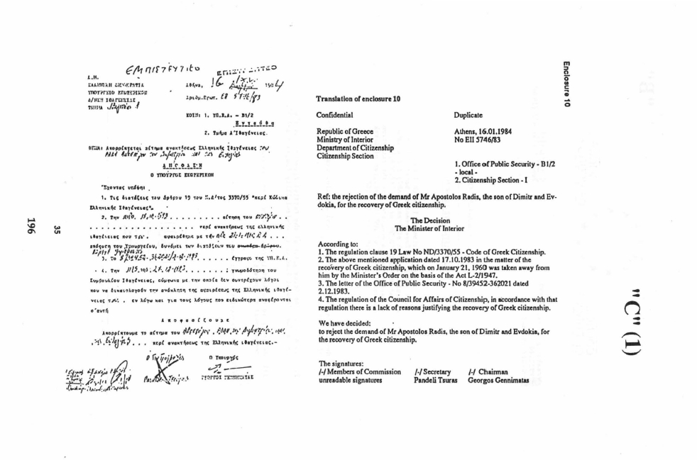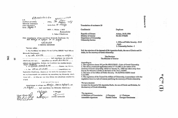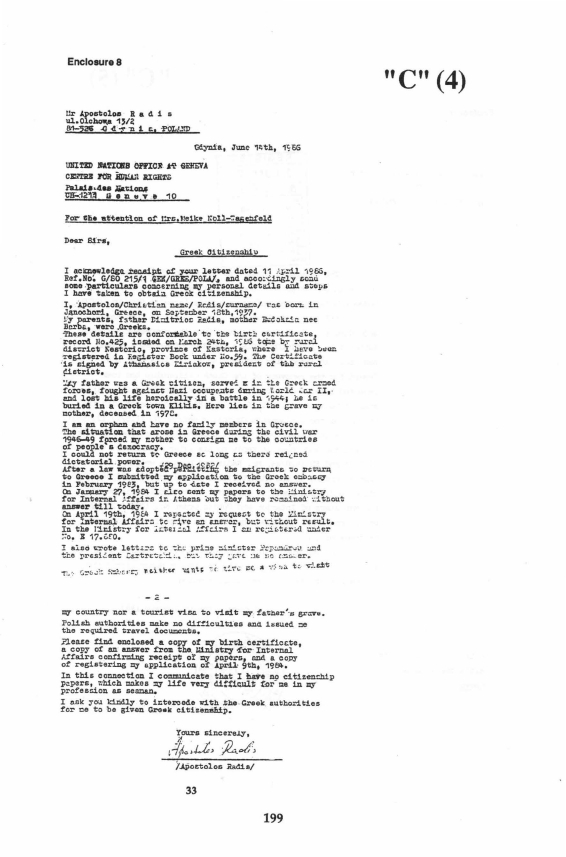Greeks). A Case History Apostolis Radis, an ethnic Macedonian living in Poland, is just one such "Child Refugee" whose application to repatriate to his home in Greece was refused by the Greek Government on the grounds that Mr Radis is not a refugee of "Greek origin" pursuant to Law 106841/82. The relevant correspondence in this regard is annexed hereto and