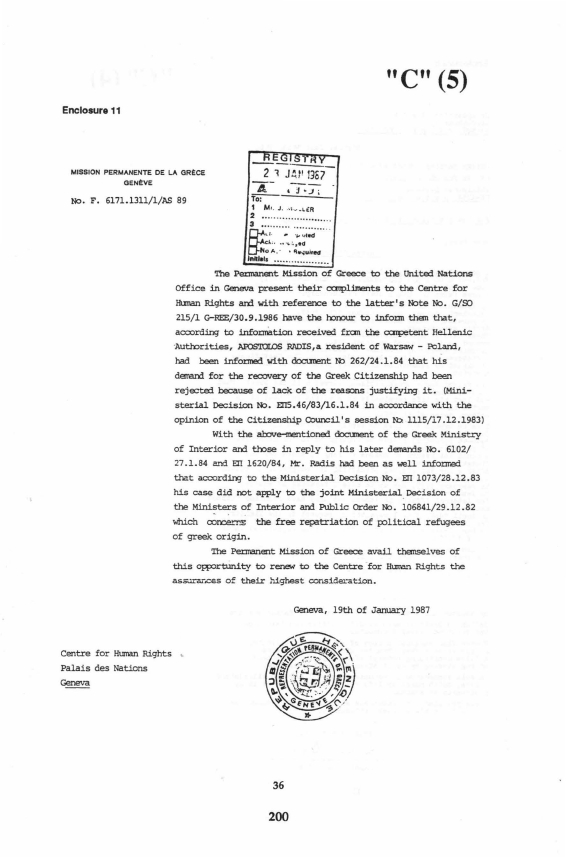 marked with the letter "C"- 1. Letter from the Greek Ministry of Interior dated January 16, 1984. 2. Letter from the Greek Ministry of Interior dated March 24, 1986. 3. Letter from the United Nations Centre for Human Rights dated April
