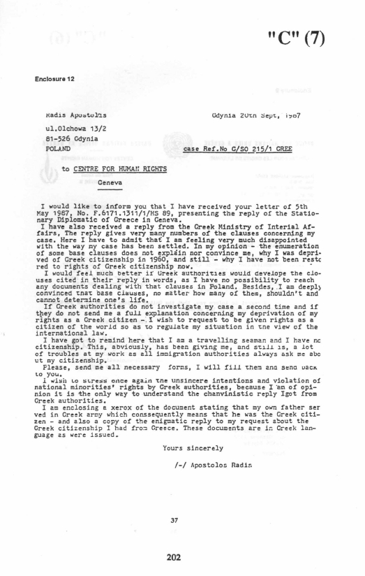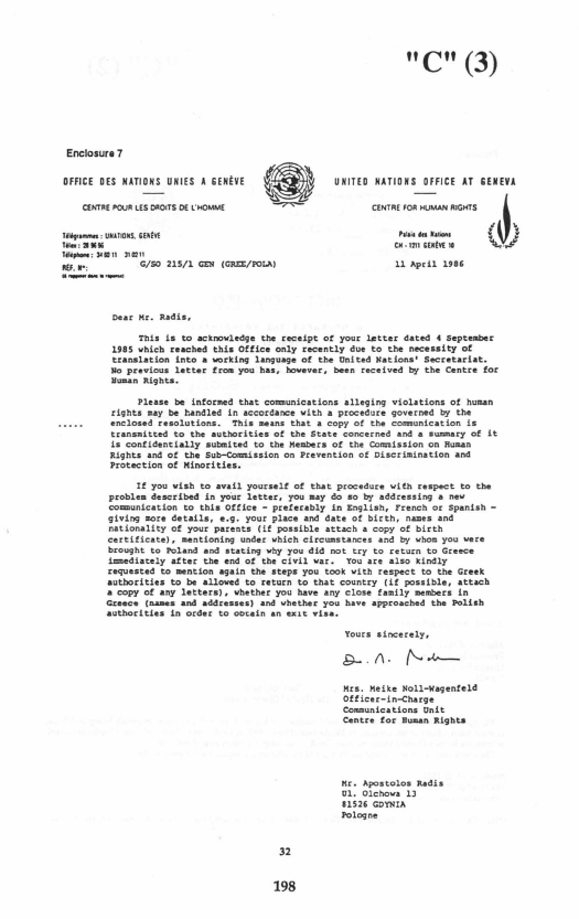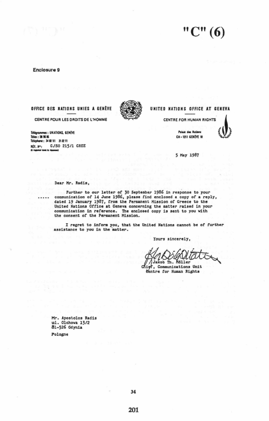 1987. 7. Letter by Apostolos Radis to United Nations Centre for Human Rights